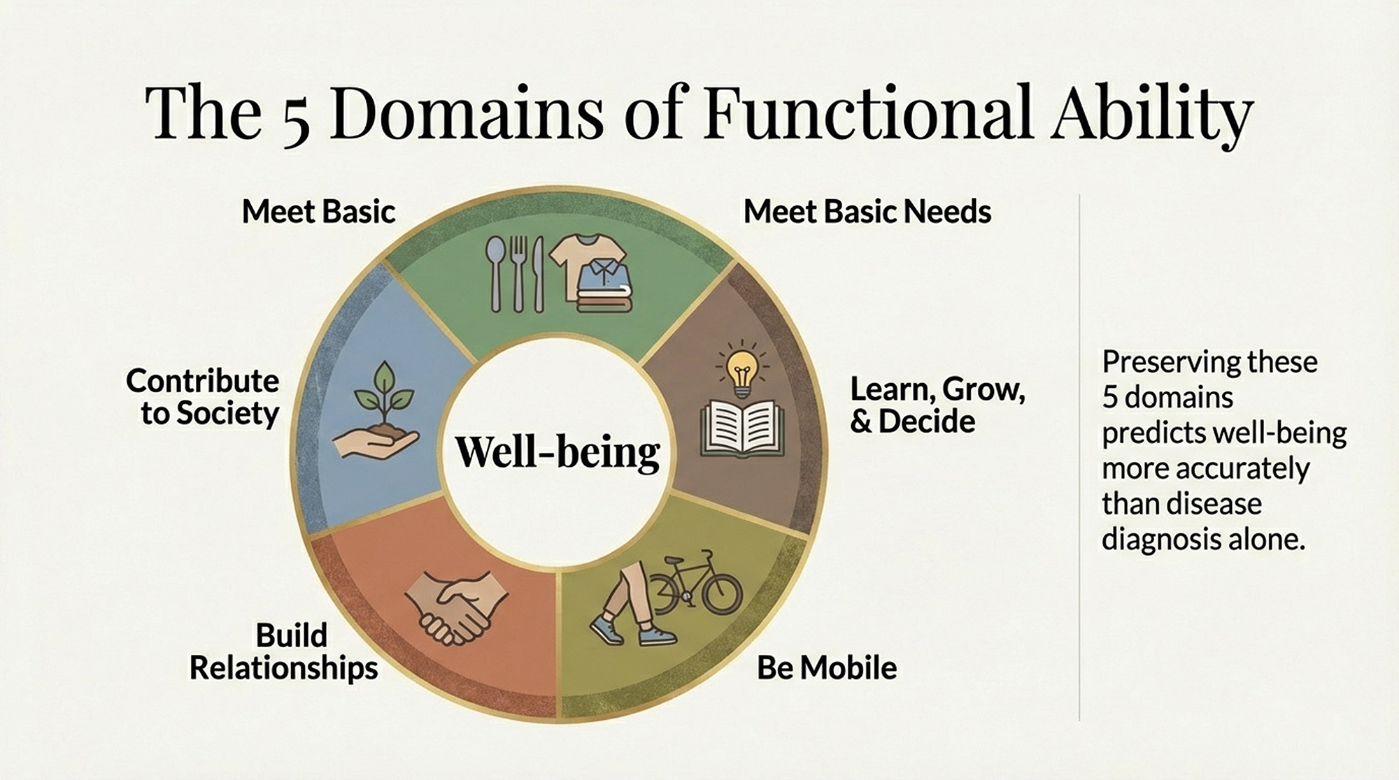 Healthy aging is rooted in functional ability—the capacity to live safely, independently, and with purpose. This includes meeting basic daily needs; staying mentally engaged and able to make decisions; maintaining mobility (with supports like canes or walkers when helpful); nurturing social connections; and finding meaning through contributing to society (such as helping a neighbor or volunteering). Just as important is the balance between a person’s intrinsic capacity (such as physical strength, brain health, and resilience) and their environment. As we age, supportive environments—safe homes, accessible transportation, and strong community networks—play an increasingly critical role in preserving independence and well-being.